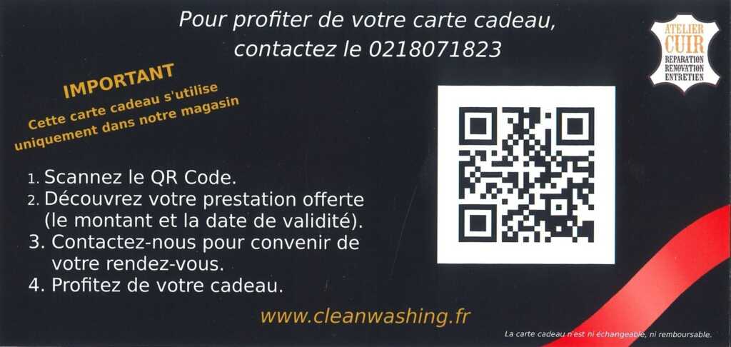 La Carte Cadeau est considérée comme un moyen de paiement dans le magasin à enseigne « CLEAN WASHING». Cette carte à offrir dont vous choisissez le montant ainsi que la prestation, permet donc de régler l’ensemble de vos achats boutique et prestations (Restauration du cuir, préparations esthétiques, vitres teintées et rénovation d’optique). Il suffit de la présenter lors de votre règlement. Cette Carte n’est pas nominative. Elle est utilisable en une fois dans la limite de la valeur de son contenu et de sa date de validité. Dans le cas où la Carte Cadeau ne couvrait pas intégralement le montant des achats, il est possible de compléter par un autre moyen de paiement. En cas d’achat d’un montant inférieur au montant de la Carte, la différence ne sera pas remboursée aux porteurs de la Carte. Cette Carte a une durée de validité de 1 an à compter de la date d’achat et ne peut donner droit à aucun échange, ni remboursement en cas d’expiration de sa date de validité dans l’hypothèse où elle n’aurait pas été utilisée. Aucune remise ne peut être effectuée sur la Carte Cadeau.